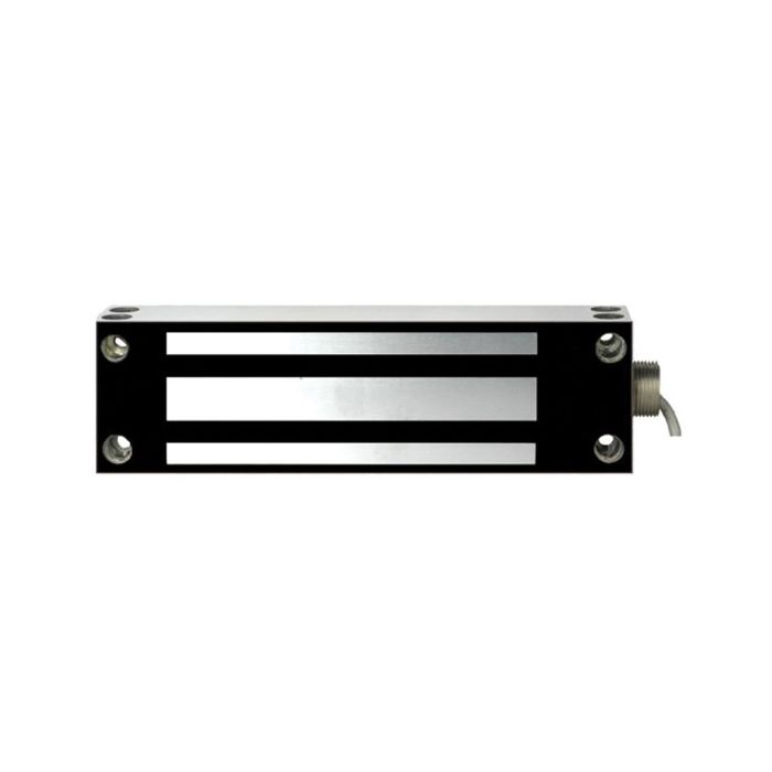 1200 lb stainless maglock with LED status, conduit fitting, field‑selectable 12/24 VDC, sealed housing, self-drilling screws & lifetime warranty.