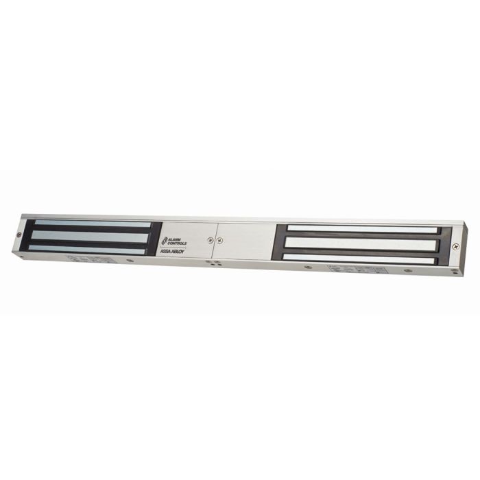 Double-door maglock, 600 lb per lock, E‑Z mount, 12/24 VDC selectable, arc suppression, UL/ULC-listed, optional LED/bond/door sensors, lifetime warranty.